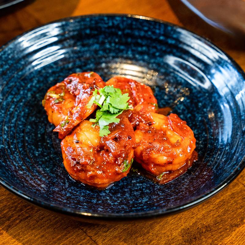 Cilantro-tamarind glazed tiger shrimp.